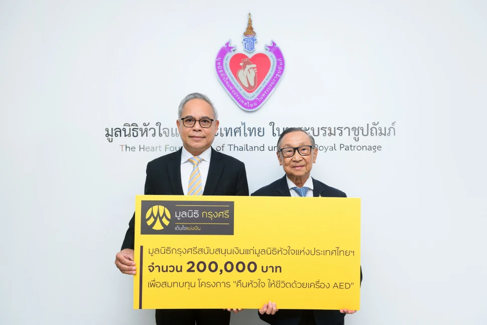 Bangkok (19 July 2024) – Mr. Pairote Cheunkrut, (left) Chief Strategy Officer of Bank of Ayudhya Public Company Limited, represented Krungsri Foundation in donating 200,000 baht to the Heart Foundation of Thailand under the Royal Patronage to fund the procurement of Automated External Defibrillators (AEDs) as part of the “Restore Life with AED” project. The donation, made for the third consecutive year, was received by Emeritus Professor Suphachai Chaithiraphan, MD (right), Vice Chairman of the Heart Foundation of Thailand under the Royal Patronage.