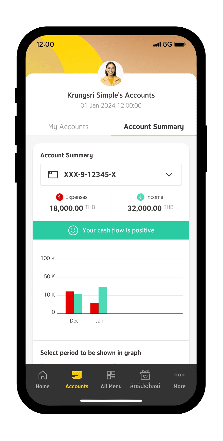 Your can view the graph summarizing your income and expense. You may select the range of period up to the past 6 months.