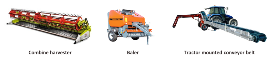 4/ The example illustration includes the following: water pump: Husqvarna, nebulizer: Solano, manual sprayer: Maruyama, battery spreader: Kisankraft, motor spreader: Nakashi, combine harvester: Claas, baler: Fieldking, conyeyor belt: Spapperi, rice miller: Talaythong, grader: Quadra Agricultural Solutions, milking machines: GreenTech, hatcher: Hightop Poultry Equipment, food mixer: Kuhn, trailer: Solis, and transporter: Antonio Carraro.