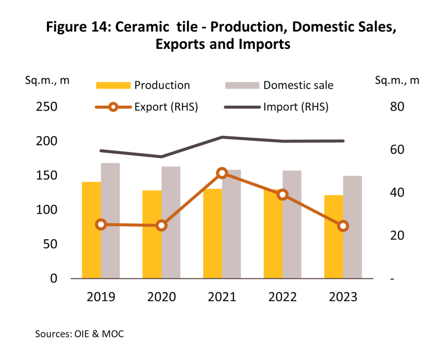Ceramic tile and sanitary ware: The domestic market will remain depressed through 2024, and the quantity of tile and sanitary ware distributed to it is forecast to contract by between -8.0% and -9.0% in the year. However, an improving outlook for the economy and the ongoing recovery in the tourism sector (arrivals are forecast to return to their pre-COVID level in 2025) will lift consumer spending power and boost investment in residential and commercial properties including offices, hotels, and other types of accommodation. Given this, sales are expected to grow by 1.0%-2.0% over 2025 and 2026 (Figure 28 and Figure 29) as domestic real estate markets firm up. Similarly, exports of tile and sanitary ware will slump by -11.0% to -12.0% in 2024 before swinging back to growth of 2.0%-3.0% annually over 2025-2026, driven in particular by the strength of the Laotian and Cambodian markets. Data from 2021 (the latest available) show that Thailand accounted for respectively 40% and 50% of all imports of tiles and sanitary ware to Lao PDR due to the post-pandemic recovery in the real estate sector. At the same time, imports of tile and sanitary ware are expected to increase by respectively 1.5% and 1.2% per year as residential, commercial, and industrial real estate markets improve. These goods will largely be imported from China and Vietnam.