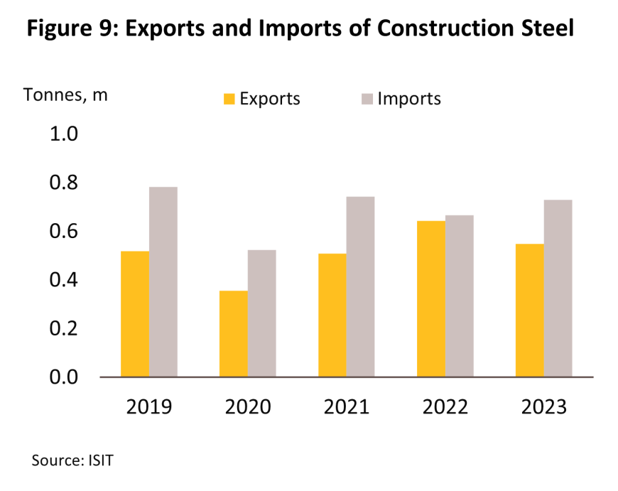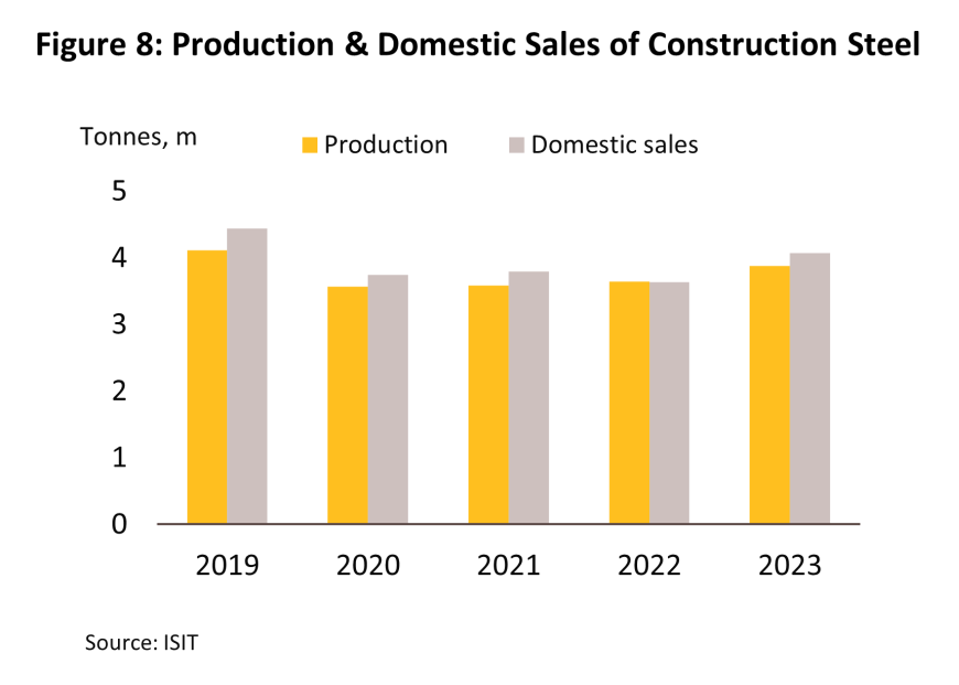 Output of construction steel climbed 6.6% to 3.9 million tonnes in 2023, while having contracted -4.3% to 3.6 million tonnes a year earlier, the volume of domestic sales jumped 11.9% to reach 4.1 million tonnes (Figure 8). Sales were boosted by the strength of private sector demand, which itself benefited from ongoing contracts for work on government-backed projects as well as developments undertaken by SME contractors, many of which were unable to complete projects due in the previous year as a result of cashflow problems, labor shortages and/or the rising cost of construction materials.