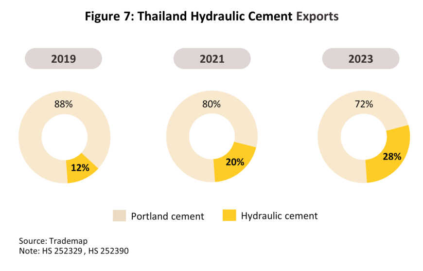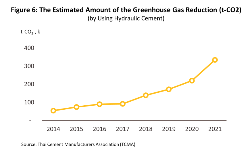 In recent years, cement producers have begun to move the industry onto a more sustainable footing by investing in the development of new technology, including the production of hydraulic cement. Because production of the latter uses eco-friendly materials in place of clinker5/, this helps to cut CO2 emissions, and since hydraulic cement can be used instead of clinker-intensive portland cement, its widespread uptake has the potential to help make significant inroads into reducing construction-related carbon emissions (Figure 6). Over the past few years, Thai manufacturers have thus been stepping up production of this for distribution to both domestic and export markets (Figure 7). Players have also been experimenting with the use of biomass-derived energy in place of the coal that the industry has traditionally relied on, for example in trials using Napier grass that have been carried out in the Saraburi Sandbox6/.