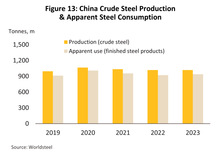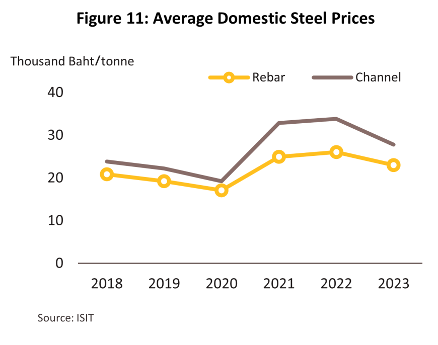 Following a couple years of increases, prices for construction steel set on global markets softened through 2023. The average price of rebar thus dropped -11.8% to THB 22,964/tonne, while for steel channel, this fell -18.0% to THB 27,783/tonne (Figure 11). Markets were affected by the depressed state of the Chinese real estate sector, which because it is the largest single consumer of steel in the country then rippled through to the steel industry, and with domestic Chinese production remaining high, players were forced to divert their output to international markets. This then increased supply and dragged on prices (Figure 12 and Figure 13).