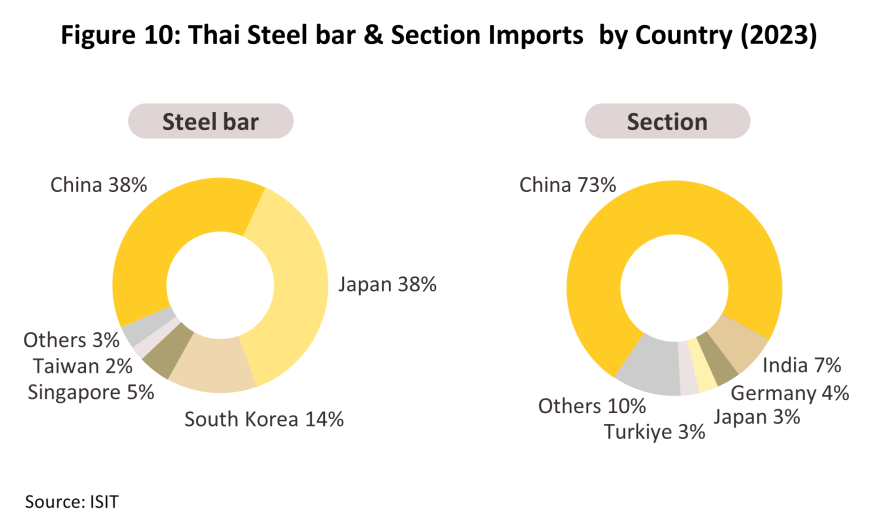 Exports of steel bar edged up 2.7% to 0.26 million tonnes on the strength of Thailand’s major overseas markets, including Myanmar (+101.8%), India (+35.0%) and Lao PDR (+8.8%), and in particular the increase in spending by governments on the construction of utilities and infrastructure. However, exports of steel section moved in the opposite direction, contracting -26.2% to 0.29 million tonnes (Figure 9). Declines were thus seen in sales into the major markets of Malaysia (-12.1%), Singapore (-36.7%) and the Philippines (-47.6%) as Thai products increasingly competed for space with Chinese imports; in 2023, imports of Chinese steel section to Malaysia and Singapore jumped by respectively 21.5% and 12.4% by value as Chinese producers responded to worsening trade tensions with the US by dumping low-cost steel on Southeast Asian markets. In the year, exports of Japanese steel to the Philippines also rose 1.8%. At the same time, imports to Thailand were up 6.7% for steel bar and 44.1% for steel section, with these largely coming from China, Japan and South Korea (Figure 10).
