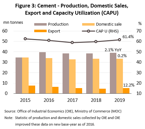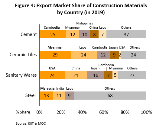 In 2019, domestic demand for building materials[3] shrank by 2.4% (compared to +3.9% in 2018), moving in the same direction as investment in construction, which growth dropped to +2.7% from +3.8% a year earlier. The incremental investment was split between: (i) public-sector spending - growth edged down from +3.2% in 2018 to +3.1% in 2019 due to delays in budget disbursement; and (ii) private-sector spending (mainly on residential accommodation) – growth decelerated to +2.1% from +6.6% in the previous year, attributed to a slowing economy and weak consumer spending (Thai 2019 GDP growth was anemic at +2.4% compared to +4.2% in 2018), and the Bank of Thailand’s revised loan-to-value (LTV) ratios which made made it more difficult for some buyers to secure a housing loan. Meanwhile, exports of construction materials[4] shrank by 2.8% as the real estate markets in the CLM zone softened.