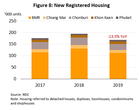 Cement: Domestic demand is forecast to contract by 0.8% this year but grow by 5-6% in each of 2021 and 2022 (Figure 15) as construction work picks up again. This growth will be split between (i) public sector projects which account for 40% of all Thai demand (Figure 16), and which will be boosted by accelerating works on infrastructure projects, especially in the Eastern Economic Corridor (EEC); and (ii) private sector (consumes 45% of domestic cement production), led by a recovery in the real estate market, especially in Bangkok Metropolitan Region and the EEC (Figure 17), which will increase demand for construction materials. Export value will drop this year due to slowing construction sectors in the CLM countries, as well as rising domestic production of cement in these countries. In Lao PDR (Thailand’s 5th largest export market at 7% share by value of Thai cement exports), the government has approved the construction of 4 new cement plants in Oudomxay, Khammouane, Luang Prabang and Savannakhet.