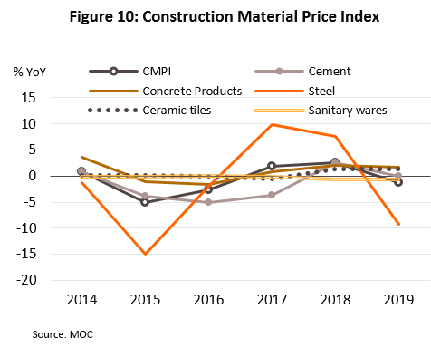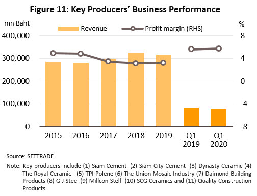 Manufacturers of construction materials registered a 8.8% YoY drop in revenue and 6.4% YoY contraction in net profit, following a drop in sales volume amid subdued construction activities. Steel producers registered the largest drop in revenue (-22.0%), followed by ceramic tile producers (-9.5%), and cement producers (-5.9%). Revenue of construction material traders contracted by 5.6% YoY due to the sluggish construction business in line with the weak economic conditions.