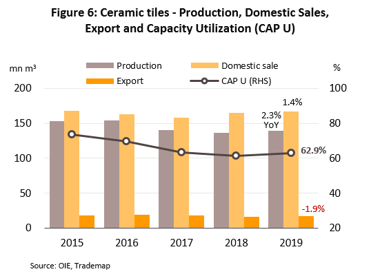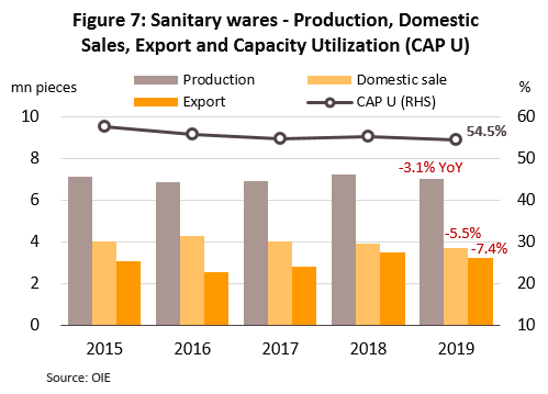 Ceramic sanitary ware: The market will shrink by 10-11% this year to 3.0-3.3 million pieces, but in 2021 and 2022, we project it would grow by 4-7% annually to 3.5-3.7 million pieces. Exports of sanitary ware will fall by a faster rate of 12.0% this year but in the following two years, it is projected to register 5-8% growth p.a. (Figure 20).