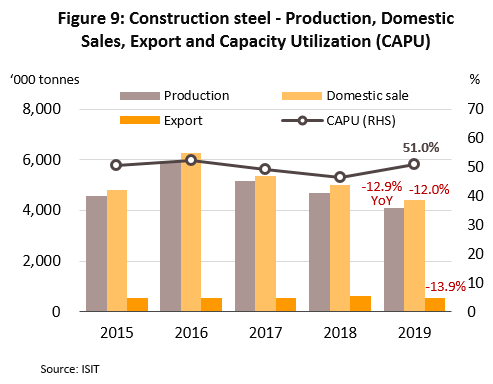 Construction steel (bar and section): Total domestic demand is expected to drop 13% to 3.8 million tonnes this year. But like the other product groups, demand is projected to grow in 2021 and 2022. For construction steel, demand is expected to grow by 2-3% with accelerating public-sector infrastructure projects, the bulk being road and rail transportation links. However, the recovery would be capped by the high level of unsold housing stock. For construction steel, we project exports to tumble by 15.0% this year (Figure 21), followed by zero or marginal growth in the subsequent two years due to high stock levels in several countries. Thai manufacturers will also face more intense competition as a result of (i) Chinese foundries dumping excess stock in the export markets, forcing Thai manufacturers to compete for market share with low-cost Chinese imports, and (ii) more Chinese foundries setting up new operations in Thailand or buying existing operations.