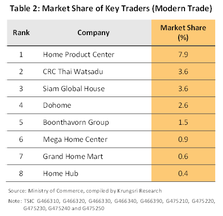 Modern traders: Revenues will be flat or drop slightly in 2020, moving with the weak construction market, especially the slowdown in real estate projects. But this will be partly offset by higher revenues from the sale of home decoration products. In 2021 and 2022, revenue growth will recover with the better outlook for the real estate market. Modern trade outlets also have an advantage over traditional operations, because of their stronger ability to expand income base driven by the following: (i) reducing shop sizes to allow expansion into local communities; (ii) opening new types of outlets in cooperation with major manufactures to better meet the needs of individual customer groups; for example, the joint venture between Boonthavorn and SCG, which launched the construction material retail operation under the SCG Home Boonthavorn brand will expand to other regions; (iii) increasing the sale of home-brands to control costs and increase profits; and (iv) adding branches in the ASEAN region.