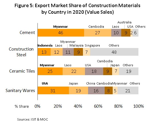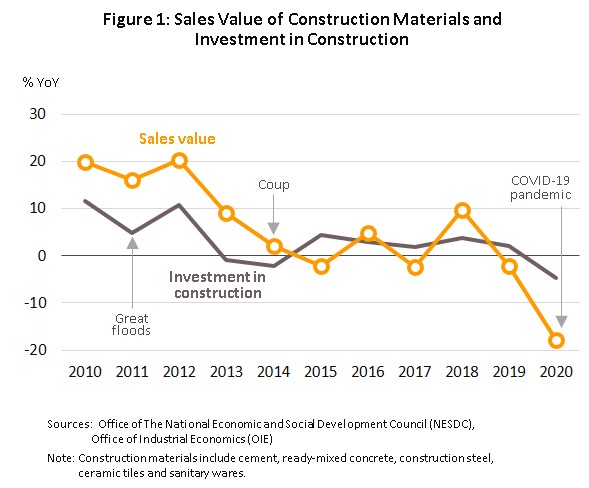 The 2020 outbreak of COVID-19 forced the government to institute a nationwide lockdown that brought much of the economy to a temporary halt, and GDP contracted by 6.1% in 2020, after growing by 2.4% in 2019. The construction sector did not escape the year’s economic turbulence and following growth of 2.3% a year earlier, in 2020, total spending on construction rose 1.4%, pulling down the volume of goods distributed to the domestic market[4] by 4.0% (a continuation of 2019’s contraction of 3.4%). However, the two halves of the market have moved in different directions: (i) Investment in construction by the public-sector expanded 4.8% as the government tried to accelerate work on infrastructure projects, but (ii) private-sector spending on construction shrank 2.9% as spending power weakened with the economic recession and real estate developers decided to hold off work on new projects (the number of new houses released to the market crashed 41.6% to 65,065 units in 2020) and instead maintained liquidity and cash flow by selling off unsold stock. Economic troubles across the region also affected exports of construction materials[5] which slumped 17.8% as real estate markets in CLM countries softened.