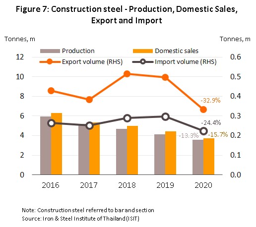 - Construction steel (bar and section): Output contracted 13.3% on weaker demand at home and overseas. Having already shrunk by 11.3% in 2019, sales in the domestic market fell by another 15.7% in 2020 thanks to sluggish real estate markets. Exports crashed 32.9%, after shrinking 3.5% in 2019 (Figure 7). Economic weakness and low levels of investment in real estate were also seen across Thailand’s main export markets, and thus sales to Malaysia, Singapore and Lao PDR slumped by respectively 58.4%, 30.6% and 15.2%. Imports moved in step with these declines and fell back 24.4% in the year.