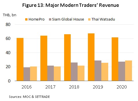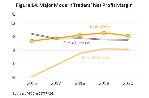 - Trader:In 2020, serious economic weakness and the effects of the lockdown led to a softening of consumer spending power, and as such, revenue for modern trade operations (HomePro, Siam Global House and Thai Watsadu) fell 3.4% from a year earlier (Figure 13). However, net profit margins remained largely unchanged (Figure 14) thanks to much stronger sales of house brands. The latter are cheaper to produce than branded products and the lower retail prices helped to attract much greater consumer interest in a market that was suffering from the recession.