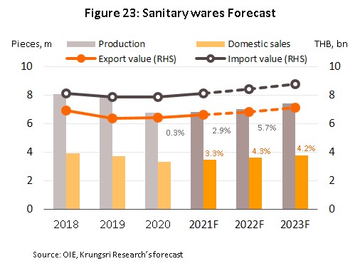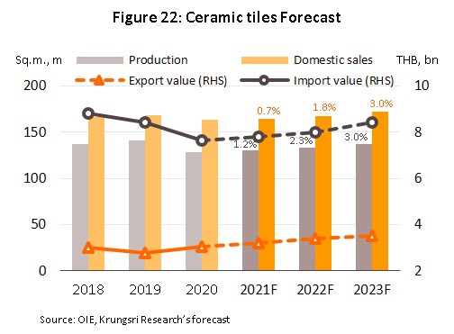 - Ceramic tiles: Domestic sales volume is expected to rise by 2.0-3.0% per year, bringing total distribution to around 165-170 million sq.m. Export values should also climb by some 5.0% annually (Figure 22) on stronger demand from the US, Lao PDR and Cambodia (major export markets). However, the recovery in the Thai real estate market will in addition pull in more imports, especially from China and Vietnam.