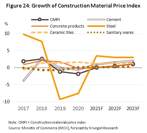 In the next 3 years, prices for construction materials will tend to rise (Figure 24) because of: (i) stronger demand from the construction sector; (ii) government policy that specifically encourages the use of Thai-made products; (iii) an expected increase in the price of upstream imports, for example, of scrap and billet, which should rise with stronger global markets; and (iv) rising energy costs.