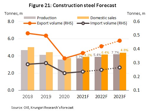 - Construction steel: The domestic market sales volume should return to growth that will tend to grow 4.0-6.0% per year over 2021-2023 (Figure 21). This outlook will be supported by (i) an acceleration in the pace of public sector infrastructure construction work, much of which will be for road and rail networks, and (ii) the government’s ‘Made in Thailand’ scheme, which specifies that by value or volume, at least 90% of all construction steel used in government-backed construction projects (excluding public-private partnerships) should be produced in Thailand.