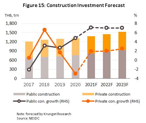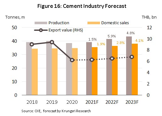 Demand for construction materials is forecast to pick up over the next 3 years. Krungsri Research sees overall investment in construction rising by 4.9-5.2% annually over 2021 to 2023, driven by government spending that is expected to climb by 7.0% per year as work moves forward on megaprojects that are linked to the EEC development (many of which are joint partnerships with the private sector). This will include phase 3 of the Map Ta Phut Port development and the high-speed rail link connecting the areas 3 airports, for which ground has already been broken. The economic recovery will also help to boost spending on construction by the private sector, which should rise by 2.1% per year (Figure 15).