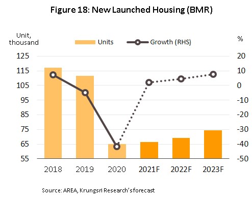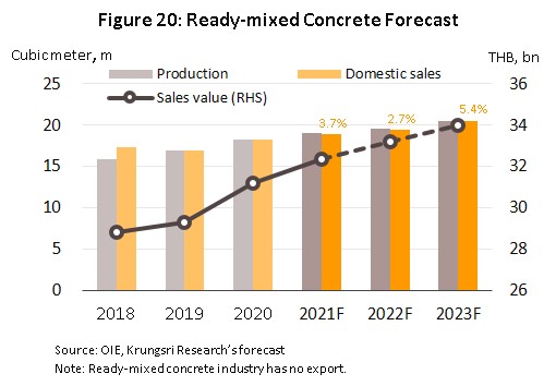 - Cement: The quantity of cement distributed to the domestic market over 2021-2023 is forecast to rise by 3.0-4.0% per year (Figure 16), supported by (i) heavier spending by the public sector on infrastructure construction, especially for work in the EEC (Table 4), and (ii) higher demand from the private sector as the real estate market revives, most notably for residential accommodation (the source of 45% of all demand for cement, Figure 17) in the Bangkok Metropolitan Region (Figure 18).