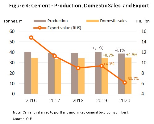 - Cement: Output fell 4.1% but domestic sales volume rose 0.9% to 34.8 million tonnes (Figure 4), supported by demand for use in government-backed infrastructure projects. However, demand in the real estate market fell. Exports suffered, slumping 33.7% and generating just THB 6.2 billion, with markets performing especially badly in Cambodia (-57.1%) and Lao PDR (-60.6%) (Figure 5).