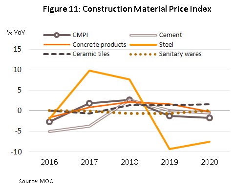 Construction Materials Price Index (CMPI): In 2020, the CMPI slipped 1.8% from its 2019 level due to the weakness in the construction sector, with falls seen in the prices of most product categories (Figure 11). This decline was led by prices for construction steel, which dropped 7.6% in step with lower prices on global markets, though the latter began to turn around at the end of the year as cyclical recovery in the world economy and the relaxation of lockdowns meant that demand returned to the construction sector, helped further by greater investment in infrastructure in many countries. Prices for concrete products slipped 2.0% on a fall in demand for concrete pipes and precast concrete flooring, while those for cement weakened 0.6% as stocks were run down. However, prices for sanitary wares edged up 0.1%, helped by price increases for mirrors, stainless steel handles and water inlet hose. Prices for ceramic tiles also rose 1.7%.