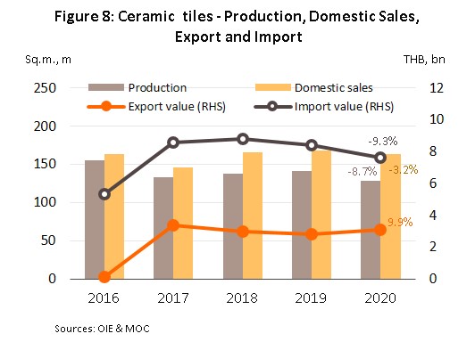 - Ceramic floor and wall tiles: Output declined 8.7% (compared to growth of 2.4% in 2019), while distribution to the domestic market slipped at 3.2%, to 163 million sq.m. (Figure 8) as investment in new residential accommodation dried up; the number of new house builds completed in the year in the Bangkok Metropolitan Region and the four major provinces of Chiang Mai, Chonburi, Khon Kaen and Phuket (together accounting for 78% of all new house construction in Thailand) fell 5.0% (Figure 9). However, exports moved against this trend and rose 9.9% on stronger demand from the US (Thailand’s 3rd biggest market for ceramic tiles, after Myanmar and Lao PDR). Weakness in private construction also drove a 9.3% drop in imports.