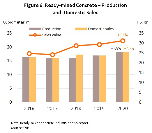 - Ready-mixed concrete: This is prepared according to domestic demand so output and sales match each other, both rising 7.8% to 18.2 million cu.m. on stronger demand for use in government infrastructure construction (Figure 6).