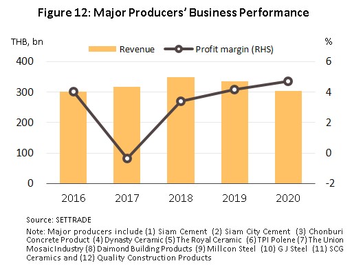 - Producer: Depressed conditions in the real estate sector weighed on manufacturers’ revenue, and this shrank 9.4% to THB 304 billion for the 12 listed companies on the stock exchange that are active in cement, ready-mixed concrete, construction steel, tiles and ceramic sanitary wares (Figure 12). However, despite this, the average net profit margin for these companies increased from 4.2% in 2019 to 4.7% in 2020.