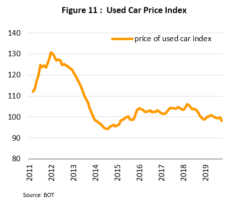 (i) Sales of commercial vehicles are forecast to rise in step with growth in demand for transport and logistic services and as a result of government investment in national infrastructure. (ii) Relative to that for new cars, the market for second-hand vehicles will be less affected by government regulation of consumer finance since second-hand dealers will be able to run promotions to stimulate sales, and because loans are assessed relative to average market prices, these may include offering loans for more than the actual value of the vehicle being sold or arranging loans that include cash-back payments to borrowers. In addition, the market for second-hand autos will also be boosted by continuing low prices (Figure 11) that will be caused by a combination of First-Car buyers purchasing new vehicles, now that the 5-year prohibition on selling their cars has fully expired, and earlier efforts to stimulate sales that have encouraged consumers to take on car debts that they cannot service, and so these vehicles are now being repossessed and released to the second-hand market. (iii) Demand will strengthen for environmentally-friendly vehicles, especially for electric vehicles (EVs), which are expected to fall in price thanks to government efforts to increase domestic production. These measures have included BOI support for investment in the production of hybrid electric vehicles (HEVs), plug-in hybrid electric vehicles (PHEVs) and battery electric vehicles (BEVs), together with moves to encourage the construction of EV charging stations, an important step in building out the infrastructure required to underpin more widespread usage of EVs in the future. In addition, the government has also overhauled auto excise rates and rates for EVs have now been set at a low level, which should naturally act as another incentive to consumers to switch to higher tech vehicles that are more fuel efficient.
