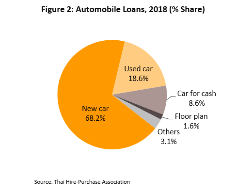 As a result of the after-effects of high growth of the First-Car Buyer scheme, which ran from 2011-2012, the auto finance sector has experienced periods of only sluggish growth over the recent past and in response, lenders have expanded the range of financial products on offer. These have included ‘car for cash’ programs, which are essentially loans secured against a vehicle, and ‘floorplan’ arrangements, which provide financing to auto dealers for orders and purchases of vehicles and for working capital. Data from the Thai Hire-Purchase Association[1] show that in 2018, despite falling a proportion of all auto financing from 77.1% to 68.2% over the past 5 years, credit for new vehicles remains the most important segment of the auto finance sector. This was followed by credit for second-hand vehicles (18.6%), loans secured on vehicles (8.6%), and credit for auto dealers (1.6%) (Figure 2).