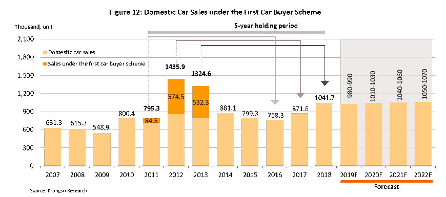 - Consumer spending power will soften under the twin impacts of the high levels of debt that are affecting most Thai households and only low levels of growth in the domestic economy. Thus, Krungsri Research estimates that the Thai economy will see average growth of just 2.8% YoY in the period 2020-2022 (Figure 13), and as of the 3rd quarter of 2019, household debt stood at 71.9% of GDP (Figure 14). This is acting as a significant brake on consumers’ willingness to take on new debt, especially for items such as automobiles, which are seen as luxury goods and so purchases of these are more responsive to changes in income than are household necessities.