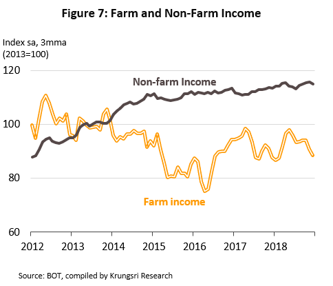 - Recovery: In 2016, the value of all outstanding auto loans contracted by -6.1% YoY in 2016. On 1H16 household purchasing power that was undercut by a variety of factors. However, despite the difficulties in the previous years, the auto finance sector saw signs of recovery in the latter half of 2016. In the first half of 2016, farm incomes were hurt by the impacts of the drought, while growth in non-farm income stalled in the face of continuing sluggishness in the economy and high levels of household debt (Figure 7), although in addition, purchases of new vehicles were rushed through at the end of 2015 in anticipation of rising duties on vehicles with engines over 1,500 cc and this then naturally led to a softening of demand in 2016. In 2019 H2, the abating of the drought helped to boost farm incomes and this then benefited sales of commercial vehicles and motorcycles. Growth in sales of new vehicles was also underpinned by strong demand for trucks and buses, luxury and imported automobiles, and ‘big bikes’. The market for second-hand vehicles also improved following an earlier period of loss-making, when prices had fallen by up to 25-30%. These cuts had been triggered by customers who had bought vehicles on the First-Car Buyer scheme failing to meet their payment schedule, thus causing their cars to be repossessed by lenders; the resulting flood of second-hand vehicles then pulled down prices substantially.