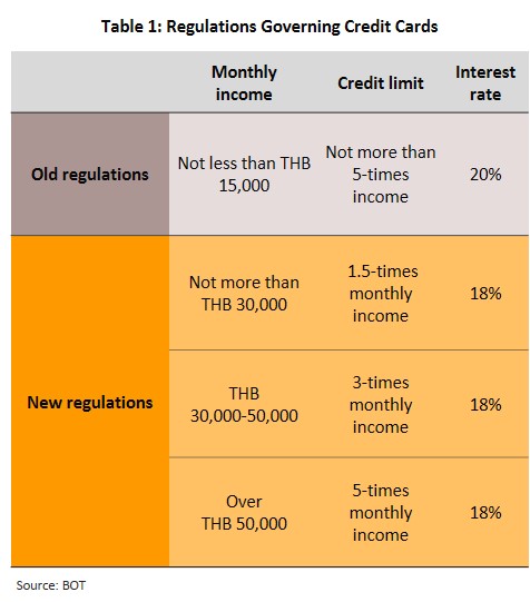 Under phase 2 of the program, certain regulations governing the issuing of credit cards will be relaxed. It is hoped that this will help with the restructuring of debts and slow the growth of NPL. Under Phase 2, (i) the maximum interest chargeable on credit card debt will be reduced from 18% to 16% per annum, (ii) those earning less than THB30,000 per month will see their maximum credit limit raised from 1.5-times to 2x their monthly income, and (iii) it will be possible to convert credit card debt to a fixed-term loan repayable in 48 installments, extend the repayment period, and pay not more than 12% per annum interest rate on the outstanding balance.