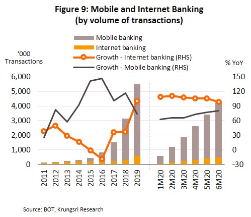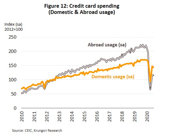 The number of new cards issued in 1H20 grew only 3.6% YoY compared to 6.9% for all of 2019. Consumer spending power was suddenly reduced as the lockdown hurt household income and employment. This was particularly significant in sectors most seriously impacted by the lockdown. And with this, the ability to service debts also weakened, pushing lenders to be more careful about issuing new credit. Card issuers responded to the worsening business environment by focusing on market segment where income exceeds THB30,000/month and/or customers that are relatively spared by the pandemic, including individuals working in medicine and e-commerce, and civil servants.
