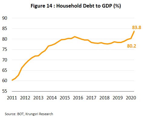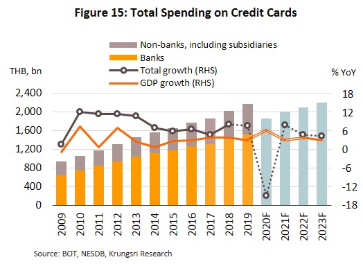 - The weak economy will undermine household income and credit-worthiness. Krungsri Research forecasts the Thai economy would contract by 6.3% this year, followed by anemic growth of 3.0-4.0% in 2021-2023. This will encourage lenders to exercise greater care in releasing new credit, including that made available through credit cards. Given this, credit growth is expected to slow in the coming period.