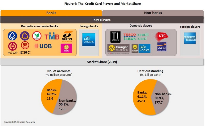 Credit card issuers currently operating in Thailand can be split into two groups. (i) The first group comprises eight Thai commercial banks (Bangkok Bank, Kasikorn Bank, TMB, Siam Commercial Bank, Thanachart Bank, UOB (Thailand), ICBC (Thailand), and The Bank of China (Thailand)); one foreign commercial bank (Citibank[2]); and one specialized Thai financial institution (Government Savings Bank). (ii) The second group consists of non-banks offering credit card services, of which there are seven: two subsidiaries of Krungsri Bank, Krungsri Ayudhaya Card and Ayudhaya Capital Services; co-brands with Krungsri Bank, operating as General Card Services, to offer the Central The 1 Credit Card, and with Tesco to offer Tesco Card services; the KTC credit card, part of Krungthai bank, Aeon credit card, part of AEON Thana Sinsap (Thailand); and American Express, a foreign non-bank (Figure 4).