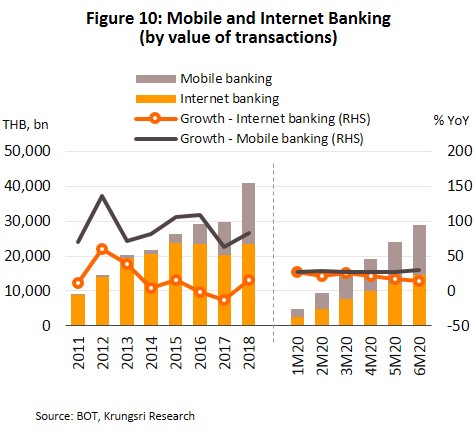 - Electronic payments are still gaining popularity, as reflected in both the number of online transactions and value of credit card purchases. In 2019, the number of payments made through internet and mobile banking platforms jumped by 99.9% and 73.5%, respectively (Figure 9), while total transaction values increased by 15.7% and 83.5% (Figure 10). In the first half of 2020, the global pandemic and national lockdown kept individuals confined largely to their homes and social distancing measures were enforced. This prompted consumers to depend more on online shopping. This led to wider acceptance of electronic payment systems. As such, the number of internet and mobile banking transactions continued to rise, by 98.3% YoY and 80.5% YoY, respectively, in 1H20. However, growth of transaction values has slowed significantly, rising by only 14.5% YoY for internet banking and 29.8% YoY for mobile banking (Figure 10). However, this was in line with a much bleaker economic situation.
