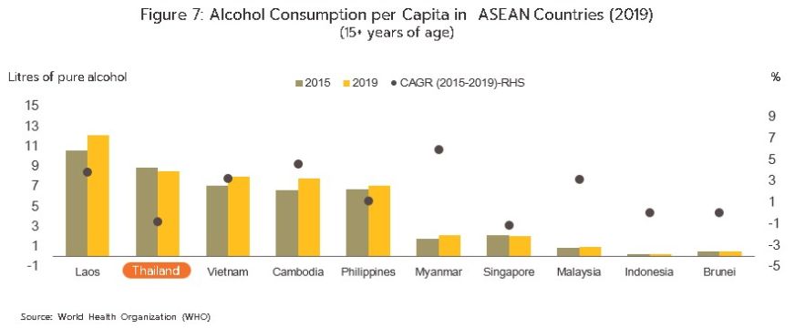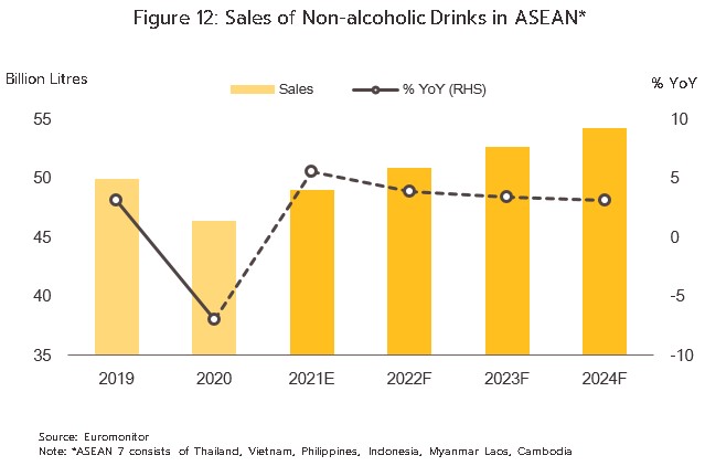 Alcoholic drinks: Although Thailand’s per capita consumption of alcoholic drinks is among the highest in the ASEAN zone, average growth rates are low (Figure 7), and as with the non-alcoholic segment, sales of alcoholic drinks contracted in 2020 and then remained weak through 8M21.