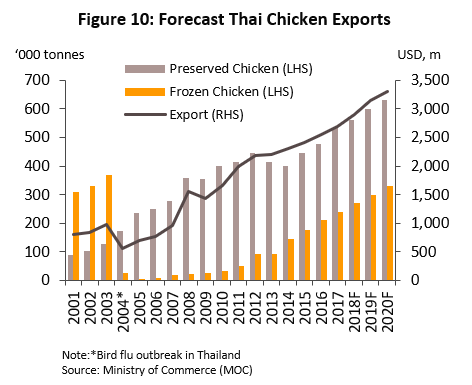 Between 2018 and 2020, the Thai frozen and processed chicken sector is expected to grow on rising demand from international markets. Exports will benefit from (i) the ongoing relaxation of restrictions from trading partners on the import of Thai frozen chicken, (ii) the opening of new markets in Asia and the Middle East, and (iii) the spread of bird flu in flocks in other countries, which will present an opportunity for Thailand to increase its exports of frozen and processed chicken.