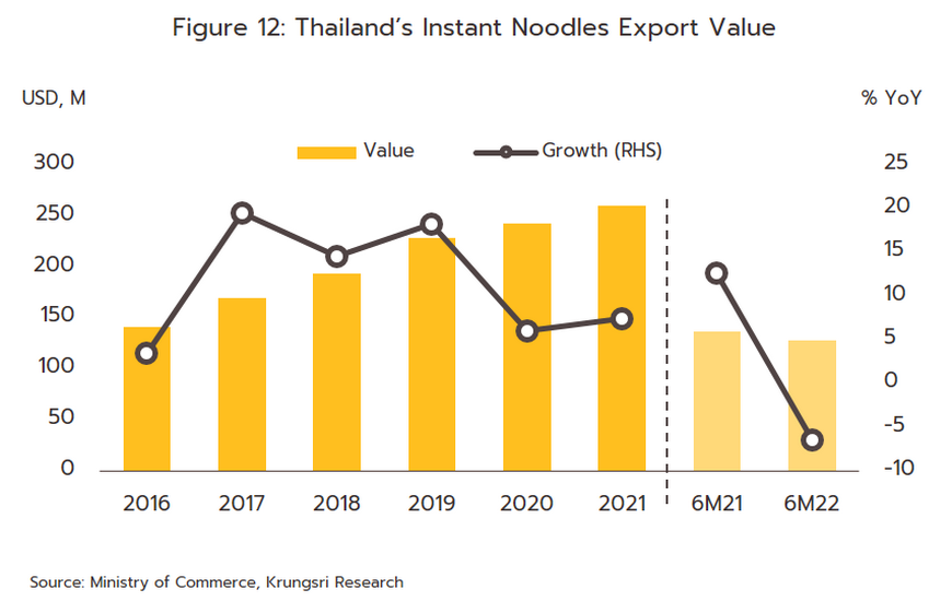 In 2021, exports rose 7.3% to a value of USD 259.2 million, helped by two main trends. (i) Controls were relaxed on cross-border trade with Cambodia, Myanmar, and Lao PDR (these three share a combined 42% of exports), with the number of active border crossings increasing from 35 in 2020 to 48 in 2021. Alongside this, Covid-19 checks on goods moved across the border were also eased, and these two factors combined to increase the value of sales into markets in Cambodia, Myanmar, and Lao PDR by 5.5%, 6.2% and 4.5%, respectively. (ii) Exports to China jumped 64.7% thanks to the increasing popularity of Thai instant noodles among Chinese consumers, most notably for spicy shrimp curry, green curry, and pink noodle flavors (source: Department for International Trade Promotion). Exports to China also benefited from the opening of the Lao-China high-speed rail link on 3 December, 2021, which now makes transporting goods to China considerably easier. As such, the contribution of the Chinese market to the total value of exports of instant noodles increased from 1.2% in 2020 to 1.8% a year later.
