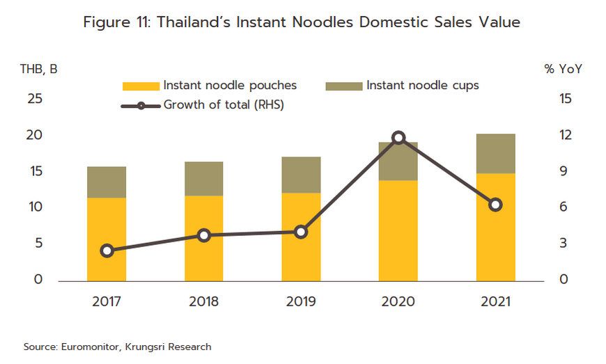 Domestic demand expanded by 6.4% to a value of THB 20 billion in 2021, with increases seen for both packet/pouch noodles (+6.8%) and cup/bowl noodles (+5.1%). Because it is a low-cost food, sales of instant noodles were boosted by the poor economic outlook and weak spending power that encouraged consumers to exercise more care over their expenditure. In addition, the imposition of pandemic control measures restricted the opening hours of restaurants and canteens and limited access to eat-in dining, and this then diverted demand to instant noodles.