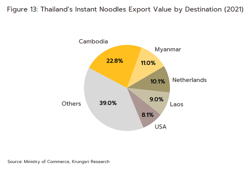 Over the period 2016-2021, an average of 80-85% of Thai instant noodle production was distributed to the domestic market, which in 2021, consumed 3.63 billion packets of instant noodles, sufficient to rank the Thai market 9th in the world. However, in terms of per capita consumption, at 51.9 packets per person per year, Thai consumption is the 4th highest in the world, coming after only Vietnam (87.1 packets/person/year), South Korea (73.3 packets/person/year), and Nepal (53.6 packets/person/year). This compares to average global consumption of 15.4 packets per person per year (source: World Instant Noodles Association: WINA, May 2022), indicating that the domestic market is close to saturation. At the same time, competition is building from the large range of alternative ready-to-eat products as well as from imported instants noodles, especially those from South Korea and Japan, which are gradually establishing a greater presence in the market. Manufacturers of instant noodles are thus having to develop new products and adopt new strategies as they fight more intensely for market share, including ramping up investment in marketing and spending more heavily on television advertising and product promotions. Export markets soak up the remaining 15-20% of output, helped by the implementation of the AFTA free-trade agreement in the ASEAN zone. Because the latter is a large market with relatively low levels of instant noodle consumption, this now presents players with the opportunity for significant expansion, especially into markets in Cambodia, Myanmar, and Lao PDR. These countries account for over 42.3% of the value of Thai instant noodle exports, and consumers in these countries are generally positively inclined towards Thai products, being familiar with Thai flavors and having faith in the quality of Thai goods.
