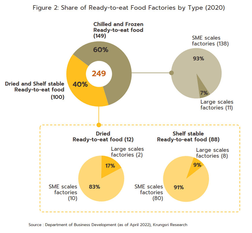 As of 2020 (the latest data available), there were 249 facilities producing ready-to-eat food registered with the Department of Business Development, the majority of which were SMEs. These can be split into: (i) 100 (or 40%) produced dried and shelf-stable ready-to-eat foods, 12 of these made dried ready-to-eat foods, mostly instant noodles. Within this, 10 (or 83%) were SMEs, the remainder being large-scale operations. On the other hand, 88 factories produced shelf-stable ready-to-eat foods, and 80 of these (91%) were SMEs. (ii) 149 sites (60% of the total) produced chilled and frozen ready-to-eat food, with 138 of these (93%) being SMEs (Figure 2).