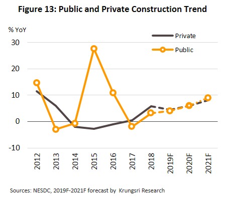 - Overall investment in construction will tend to rise steadily due to the government’s plans for developing large-scale national infrastructure[11]. Krungsri Research thus estimates that government-backed construction will expand by 3-5% in 2019, 5-7% in 2020 and 8-10% in 2021 (Figure 13) and that this will help to pull in private sector investment with it through the crowding-in effect, with funds going to industrial, commercial and residential real estate developments. This will then lifts private sector investment in construction by 4-5% in 2019, before the market picks up and grows by 5-7% in 2020 and then by 7-9% in 2021. These factors will then naturally increase demand for the supply of transportation services, particularly of the large vehicles required for moving building materials.