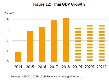 Following growth of 2.3% in 2018, through the period 2019 to 2021, it is expected that road freight businesses will see growth of 1-2% per year on rising demand for transport services that will move in line with growth in the economy more generally (Krungsri Research forecasts annual GDP growth of 3-3.5% in 2019-2021) (Figure 12). Factors supporting increased demand for different market segments are given below.