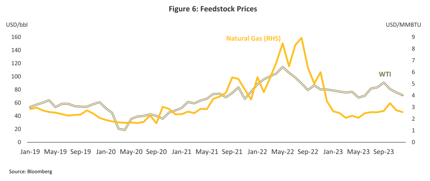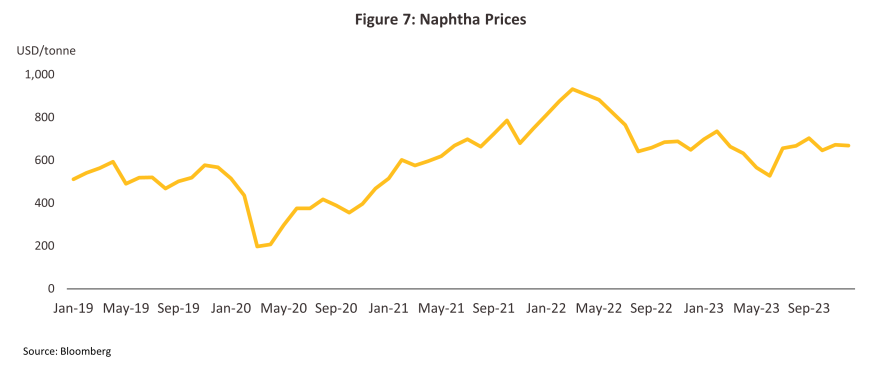 A decline in feedstock costs in 2023 aligned with the softening of crude oil and natural gas prices due to two key factors: (1) fears of a potential energy crunch eased as sales of Russian crude to India and China remained strong despite Western export embargoes, and (2) demand for crude in China, the world's second-largest oil consumer, was impacted by a sluggish domestic economy. Nonetheless, these trends were partially offset by OPEC+ tightening production quotas and ongoing concerns about the protracted Russia-Ukraine war and conflicts involving Israel and Hamas, which heightened fears of wider escalations. Overall, average prices for Dubai Crude fell by 16.4% to USD 82.5/bbl, resulting in naphtha prices (derived from crude) dropping by -15.9% to USD 653/tonne. Similarly, average natural gas prices declined by -59.4% to USD 2.6/MMBtu (Figure 6 and Figure 7).