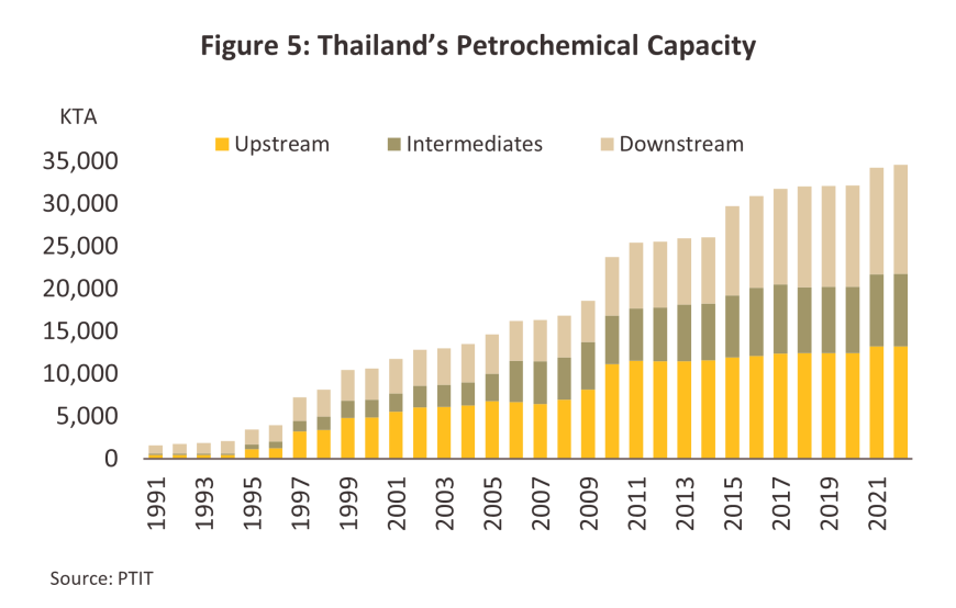 Thai petrochemical sector: In 2022, the Thai petrochemical sector had a total production capacity of 34.6 million tons, the largest in the ASEAN region and 16th largest in the world (Figure 5).