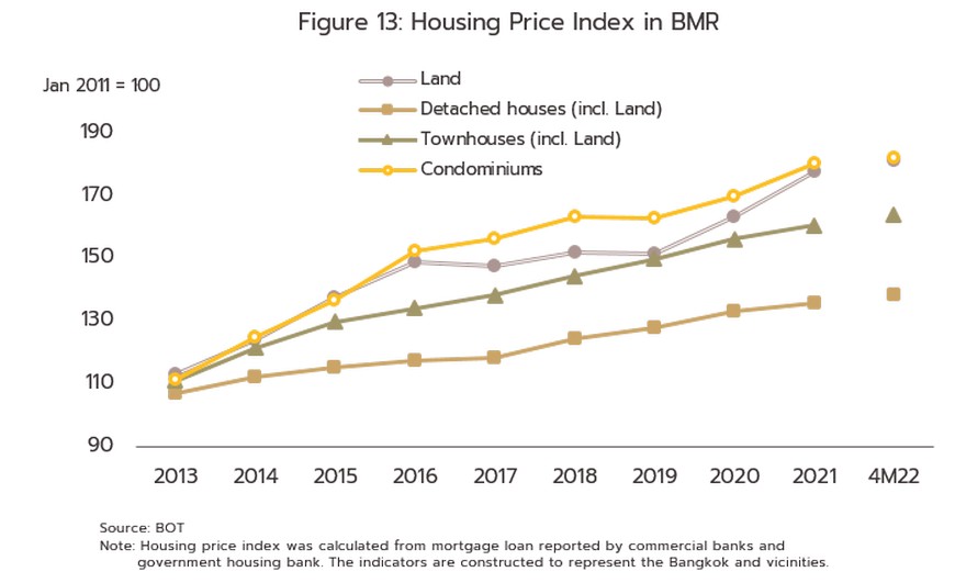 Over 4M22, housing prices continued to rise, led by those for low-rise accommodation. Thus, prices for townhouses and detached houses were up by respectively 3.9% YoY and 3.6% YoY, while condominium prices rose by 3.3% YoY (Figure 13). These increases were principally driven by the rising cost of construction.