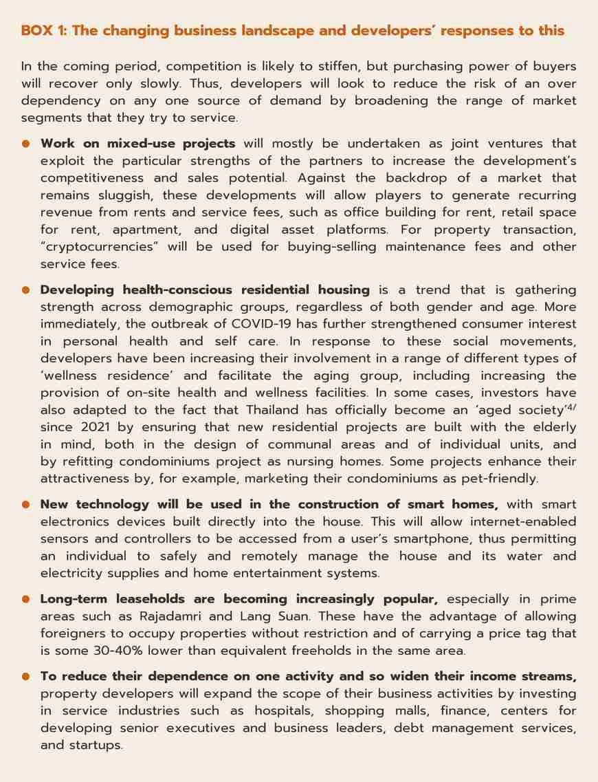 Through 2022 to 2024, the housing markets in the BMR should gradually strengthen on an economic rebound and rising consumer spending power. However, the war in Ukraine has driven up the price of oil and added to inflation globally, and this will continue to affect construction costs. The Thai real estate sector will also be impacted by the rising cost of land and the upward trend in interest rates. Large players should be able to continue to grow through these difficulties, but SME developers will come under greater pressure from stiffening competition that will affect sales, the cost of construction materials, and the price of land (which is becoming harder to find and so correspondingly more expensive). Players will therefore tend to look for partners to work with, whether that be other Thai companies or overseas operators, since by expanding their capital base, they will be better able to raise their competitiveness.