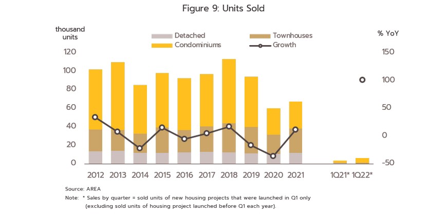 In 1Q22, the number of new condominiums coming to market jumped 207% YoY to 15,210 units, these having a total value of THB 43.1 billion (down 9.1% YoY). Sales of new condominiums surged 207.2% YoY, bringing the total supply (Stocks + newly launched) of condominiums to 100,523 units.