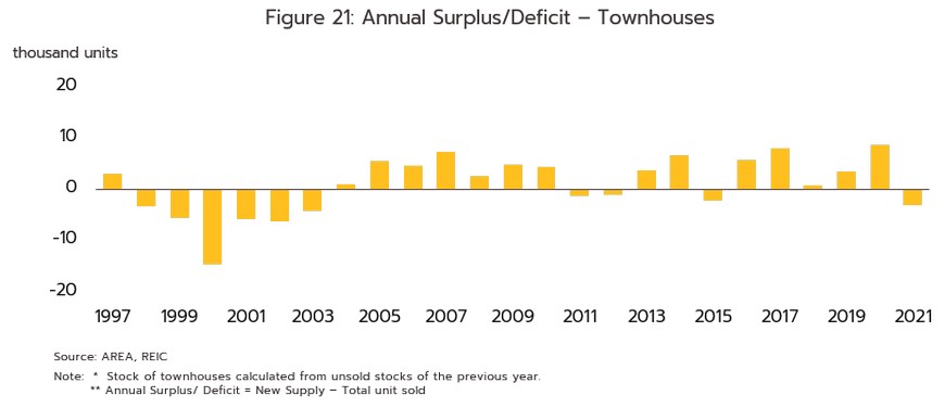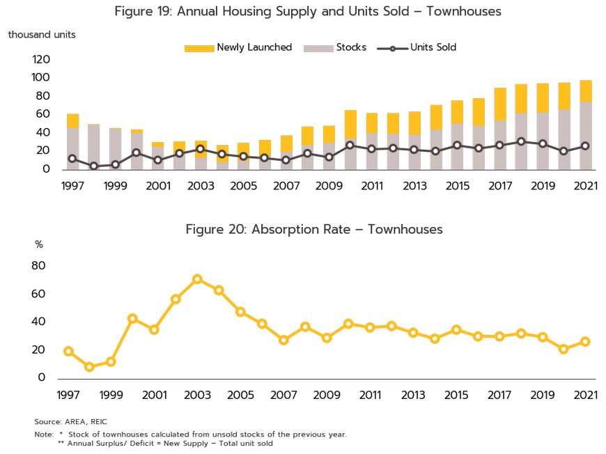 The pandemic and the need to adapt to new ways of living that emphasize physical distancing increased demand for townhouses among owner occupiers who were put off by the rising price of detached houses and the restricted size of most condominiums. In 2021, the supply of new townhouses fell 20.1% to 23,248 units, (43% of all new housing supply). However, the average sale price of these increased 3.4% YoY to THB 3.0 million, while total sales increased 28.2% to 26,356. This then cut cumulative unsold units by 4.1% YoY to 71,945.